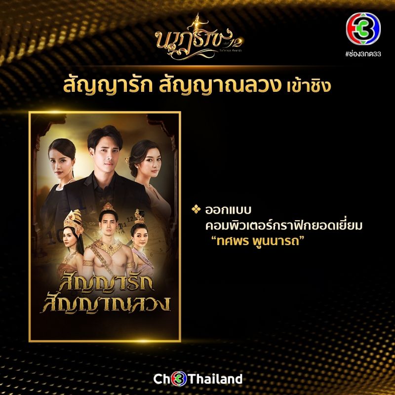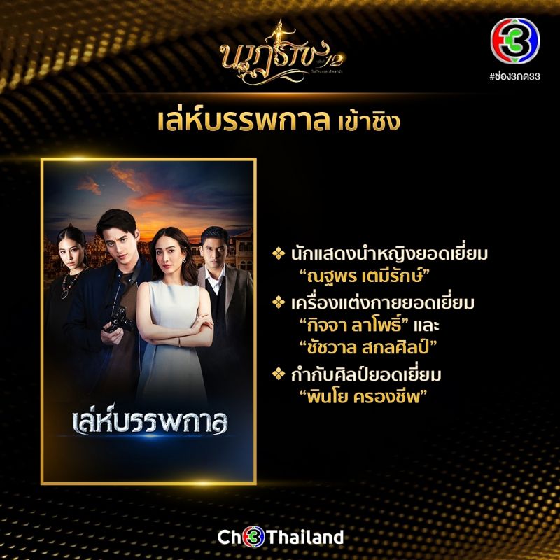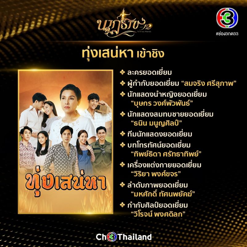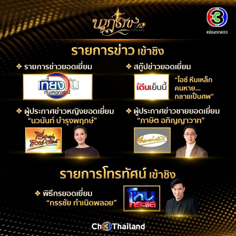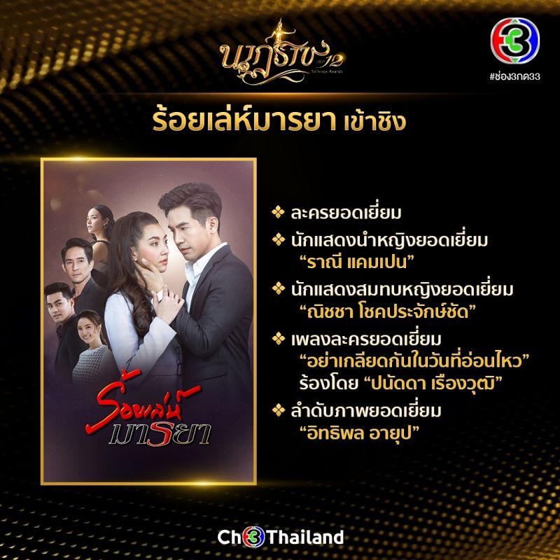 ช่อง 3 ไม่มีแผ่ว! จัดเต็มคอนเทนต์คุณภาพ ละคร รายการข่าว-โทรทัศน์ เข้าชิง รางวัลนาฏราช ครั้งที่ 12 ปี 2563 ถึง 27 รางวัลรางวัล นาฏราช ครั้งที่ 12 ปี 2563 รางวัลเกียรติยศสำหรับคนทำงานในวงการบันเทิง จัดโดยสมาพันธ์สมาคมวิชาชีพวิทยุกระจายเสียงและวิทยุโทรทัศน์ ประกาศผู้เข้าชิงเป็นที่เรียบร้อยแล้ว สำหรับช่อง 3 ส่งคอนเทนต์คุณภาพ ด้านละคร ทั้งคนเบื้องหน้าเบื้องหลังเข้าชิงแบบจัดหนักจัดเต็มมากถึง 27 รางวัล นำโดยละครทุ่งเสน่หา เข้าชิงถึง 9 รางวัล ตามด้วยละครร้อยเล่ห์มารยา 5 รางวัล อกเกือบหัก แอบรักคุณสามี เข้าชิง 4 รางวัล เล่ห์บรรพกาล เข้าชิง 3 รางวัล ปิดท้ายด้วยสัญญารัก สัญญาณลวง เข้าชิง 1 รางวัล ด้านรายการข่าวและรายการโทรทัศน์ เข้าชิง 4 รางวัล และ 1 รางวัล ตามลำดับรายละเอียดละคร รายการข่าว รายการโทรทัศน์ ที่เข้าชิงทั้งหมด 27 รางวัล มีดังต่อไปนี้