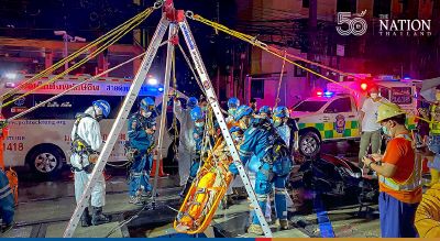 Rescue workers used a stretcher and pulley system to lift the victim, Chai (last name withheld), out of the hole. Medics found he had suffered several severe injuries, including a broken right leg. He was rushed to Paolo Chokechai 4 Hospital for treatment.