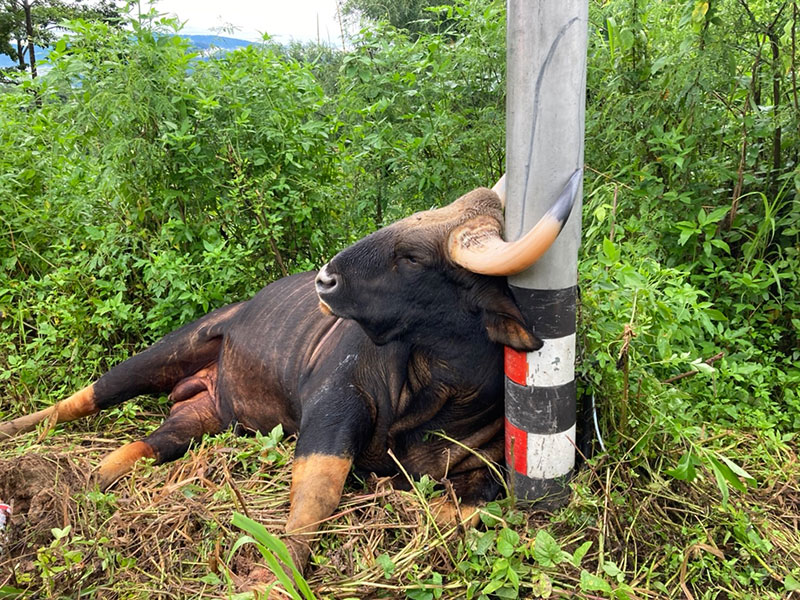 ทางเจ้าหน้าที่อุทยานแห่งชาติ กำลังประสานเจ้าหน้าที่ไฟฟ้ามาทำการตัดกระแสไฟเพื่อตรวจสอบในเบื้องต้นถึงสาเหตุการเสียชีวิต ก่อนที่จะนำรถเคนมาทำการเคลื่อนย้ายกระทิงไปให้แพทย์ทำการพิสูจน์หาสาเหตุการเสียชีวิตอีกครั้ง. 012