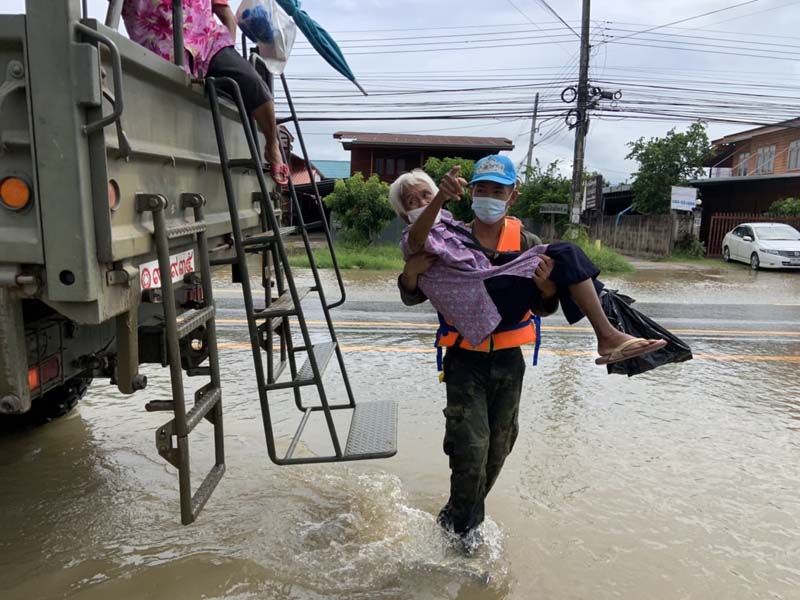 ให้ภาพเล่าเรื่อง… ทหารจิตอาสาอุ้มคุณยาย รับ-ส่งปชช.กลับบ้านพัก หลังน้ำท่วมสูง