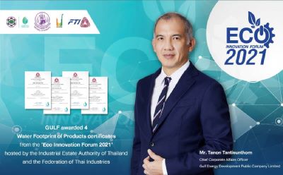 Recently, Gulf Group (GULF) was awarded four ‘Water Footprint of Products’ certificates at the Eco Innovation Forum 2021 hosted virtually by the Industrial Estate Authority of Thailand (IEAT) in collaboration with the Ministry of Industry and the Water and Environment Institute for Sustainability (WEIS) via Zoom. The awards reinforce the company’s capabilities in managing water resources efficiently and sustainably in accordance with international standards while remaining socially and environmentally responsible in the areas where the company operates – as reflected by the efforts to lower greenhouse gas emissions both directly and indirectly in a move towards a low-carbon society.