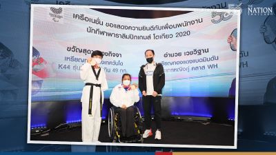 Nation Multimedia Group (NMG)’s chairman Shine Bunnag and other executives welcomed staffers Amnouy Wetwithan and Khwansuda Phuangkitcha, who returned with a bronze each from the Tokyo 2020 Paralympic Games.