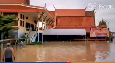 The walls and flood protection line of Wat Chula Manee in Bang Ban district, Phra Nakhon Si Ayutthaya province collapsed on Sunday, after the Chao Phraya Dam had released water at 2,779 cubic metres per second.
