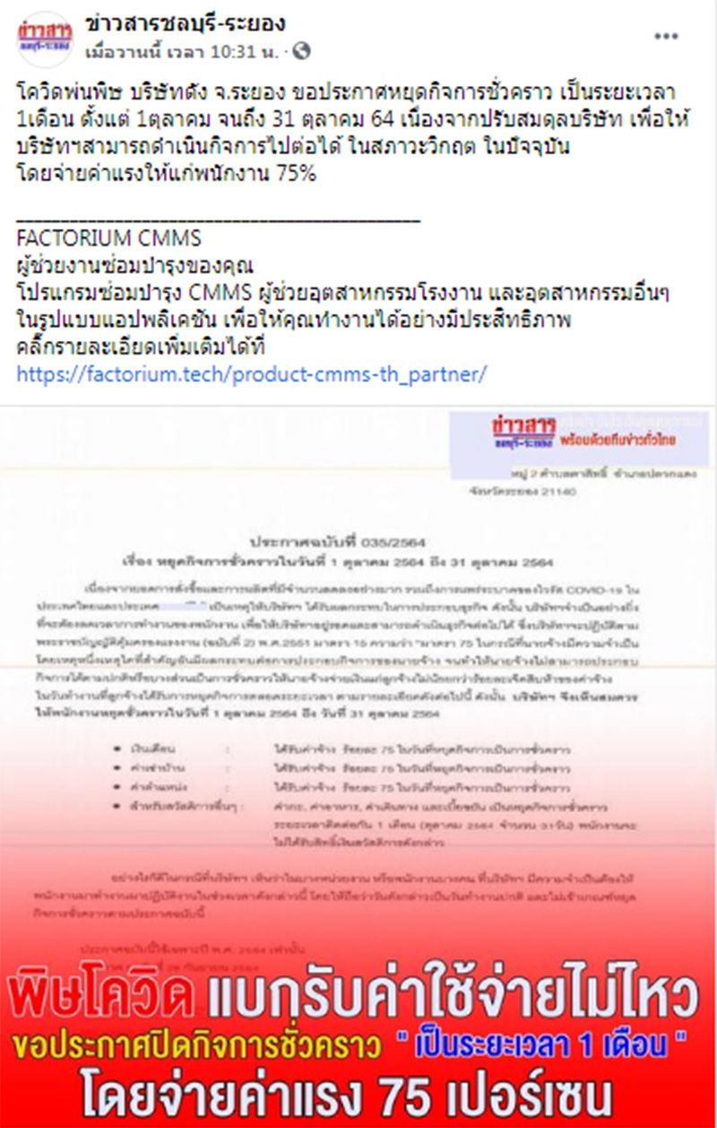 วันที่ 6 ตุลาคม 2564 เพจเฟซบุ๊ก “ข่าวสารชลบุรี–ระยอง” โพสต์ภาพเอกสารของบริษัทแห่งหนึ่งในจังหวัดระยอง พร้อมข้อความระบุว่า โควิดพ่นพิษ บริษัทดัง จ.ระยอง ขอประกาศหยุดกิจการชั่วคราว เป็นระยะเวลา 1 เดือน ตั้งแต่ 1 ตุลาคม จนถึง 31 ตุลาคม 64 เนื่องจากปรับสมดุลบริษัท เพื่อให้บริษัทฯ สามารถดำเนินกิจการไปต่อได้ ในสภาวะวิกฤติ ในปัจจุบันโดยจ่ายค่าแรงให้แก่พนักงาน 75%