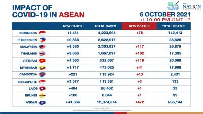 The number of Covid-19 cases crossed 12.37 million across Southeast Asia, with 41,066 new cases reported on Wednesday (October 6), higher than Tuesday’s tally at 39,342. New deaths are at 472, increasing from Tuesday’s number of 436. Total Covid-19 deaths in Asean are now at 266,144.
