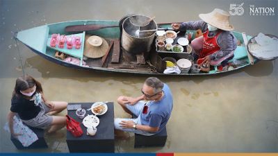 Since floods have not receded and the pier outside the hotel is still inundated, he came up with the idea to serve coffee and food to tourists while they soak their feet in the water. Famous boat noodles vendor “Jae Joom Pak Daeng” (red-lipped Miss Joom) was also at hand to serve up delicious delights.