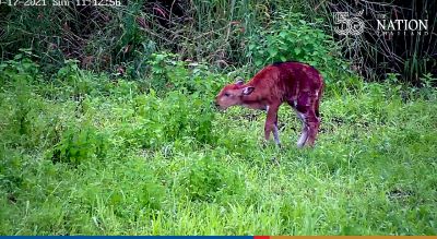 As soon as the calf was spotted on CCTV standing alone in the rain near the Thung Faek area, the chief of the Huai Kha Khaeng Wildlife Breeding Station and his team rushed to rescue it. The two- or three-week-old male calf was in a weak condition and had skin problems in his hindquarters and the belly.
