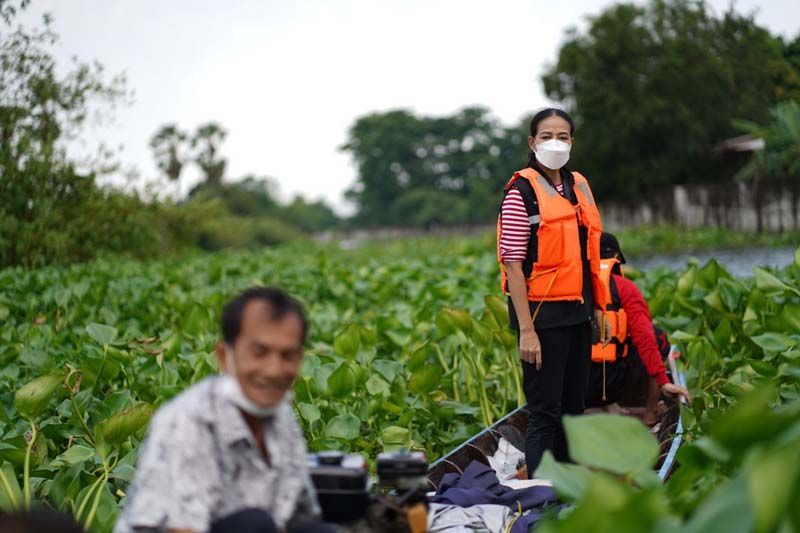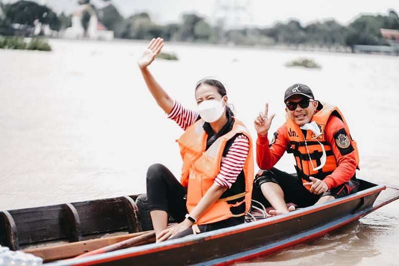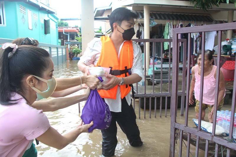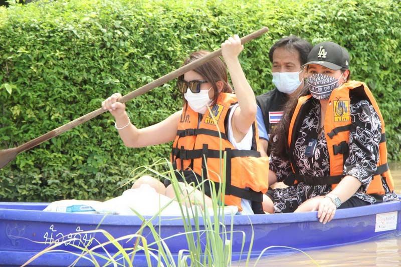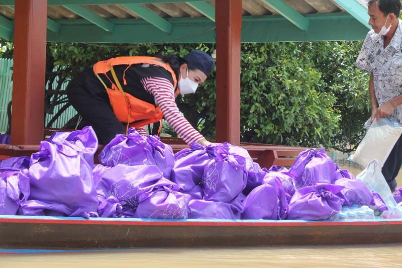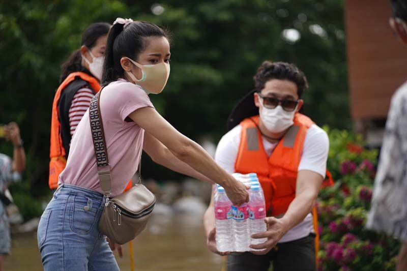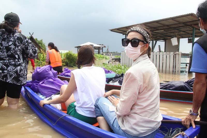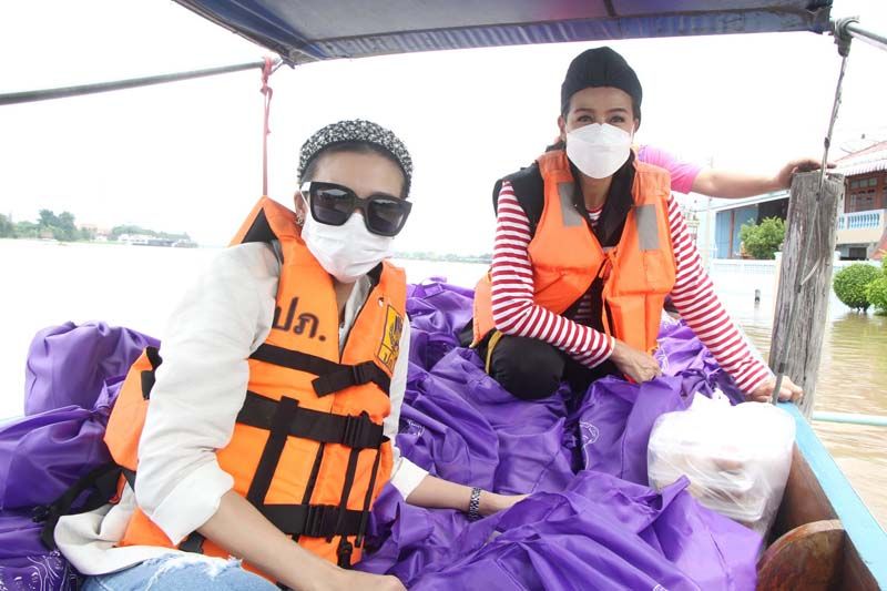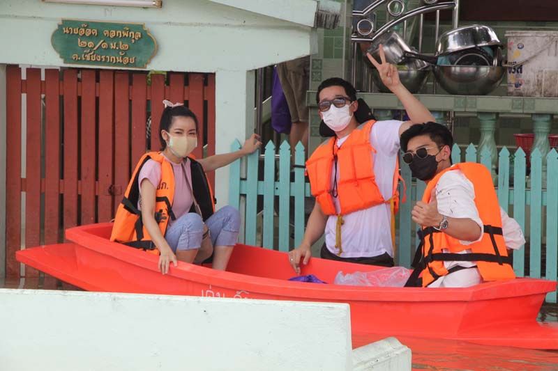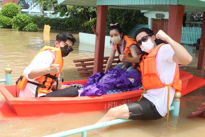 ซึ่งงานนี้ทั้งผู้จัดและเหล่านักแสดงก็ลงพื้นที่ลุยน้ำเอง ทั้งพายเรือ ลุยน้ำเข้าไปเคาะประตูพี่น้องชาวปทุมธานีเพื่อมอบของให้ถึงมือมากที่สุด บ้างก็ช่วยหิ้วของส่งถึงบ้านก็มีแม้ระหว่างทางฝนจะตกลงมาอย่างหนักจนต้องรีบขึ้นฝั่งแต่เมื่อฝนหยุดก็ลงเรือลุยน้ำแจกต่อจนเสร็จภารกิจ โดยงานนี้ต้องขอขอบคุณผู้ใหญ่บ้าน อนุวัตร ใจชอบ ต.เชียงรากน้อย อ.สามโคก จ.ปทุมธานี ที่มาลงพื้นที่ช่วยประสาน ช่วยลากเรือ ร่วมตากฝนแบบเต็มที่ไม่ถอยเหมือนกัน ทั้งนี้ผู้จัด กบ-ปภัสรา ได้เผยความรู้สึกหลังเสร็จดังตั้งใจในครั้งนี้ว่า