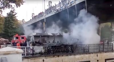 Footage shared by the news agency showed a charred husk of the small military bus after it had been doused with water. At least three people were wounded in the blast.