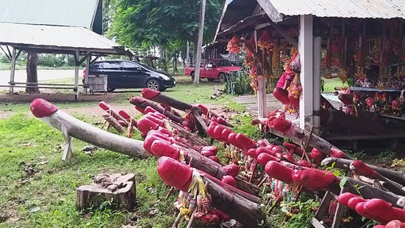 จนกลายเป็นสิ่งศักดิ์สิทธิ์ประจำหมู่บ้าน และนอกจากปลัดขิกที่นิยมนำมาเป็นเครื่องเซ่นไหว้ ก็ยังมีหัวหมู ไก่ต้ม เหล้าขาว อาหารคาว-หวาน เครื่องสำอาง และชุดไทย ถวายเป็นเครื่องแก้บน อีกด้วย. -008