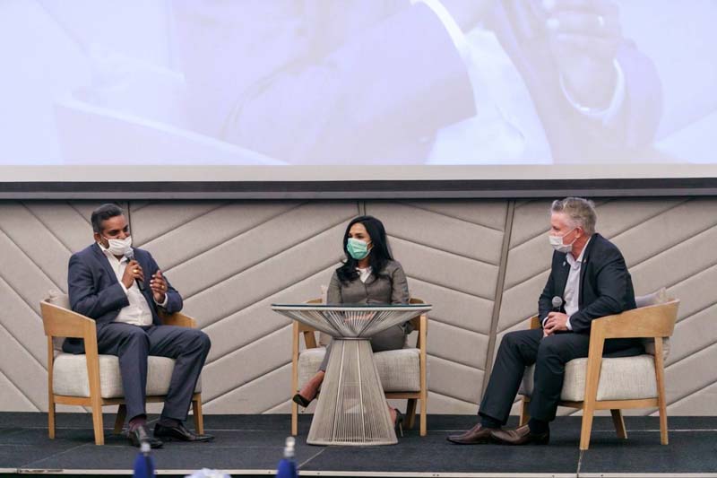 ดร.ลัษมณ อรรถาพิช รองเลขาธิการสำนักงานคณะกรรมการนโยบายเขตพัฒนาพิเศษภาคตะวันออก (สกพอ.) กล่าวว่า “สกพอ.ขอให้ทุกท่านมั่นใจว่าโครงการต่างๆ ในอีอีซีจะยังคงเดินหน้าต่อไปแม้ในช่วงสถานการณ์การแพร่ระบาดโควิด-19 โดยโครงการท่าเรือแหลมฉบังและการพัฒนาเมืองการบิน (Airport City) จะเป็นองค์ประกอบที่สำคัญสำหรับเครือข่ายโลจิสติกส์ที่หลากหลายในพื้นที่อีอีซี สกพอ.ได้ดำเนินงานร่วมกับหน่วยงานต่างๆเพื่อสร้างระบบการทำงานโลจิสติกส์ที่ไร้รอยต่อซึ่งจะช่วยเพิ่มประสิทธิภาพของโลจิสติกส์ทั้งในอีอีซีและในระดับประเทศ ในส่วนของสาธารณูปโภคดิจิทัล ได้มีการติดตั้งเครือข่าย 5G ในพื้นที่อีอีซีเป็นที่เรียบร้อยแล้ว ทั้งหมดนี้จะช่วยนำอีอีซีให้กลายเป็นศูนย์กลางของภูมิภาคเอเชียทั้งด้านธุรกิจและการลงทุน” ทางด้านสุวิมล ตวงวุฒิกุล รองประธานหอการค้าจังหวัดชลบุรี กล่าว่า “ถือเป็นโอกาสที่ดีสำหรับสมาชิกหอการค้าชลบุรีที่ปัจจุบันมีทั้งหมด 175 บริษัทได้มีโอกาสพบปะนักธุรกิจและนักลงทุนชาวต่างชาติปัจจุบันชลบุรีมีผลิตภัณฑ์มวลรวมคิดเป็น 6.4 เปอร์เซ็นต์ของผลิตภัณฑ์มวลรวมทั้งประเทศ เมื่อรวมกับฉะเชิงเทราและระยอง ทั้งสามจังหวัดมีผลิตภัณฑ์มวลรวมสูงถึง 14.7 เปอร์เซ็นต์ ของผลิตภัณฑ์มวลรวมทั้งประเทศ ตัวเลขนี้สามารถสูงขึ้นอีกได้เมื่อมีบริษัทในภาคการผลิต และภาคบริการบนฐานของเทคโนโลยีสมัยใหม่และนวัตกรรมเข้ามาจัดตั้งในพื้นที่ เช่น บริษัทในกลุ่มกระบวนอัตโนมัติและหุ่นยนต์กลุ่มอากาศยานและการขนส่ง กลุ่มพลังงานชีวมวลและชีวเคมี รวมทั้งกลุ่มธุรกิจดิจิทัล ซึ่งจะช่วยสร้างโอกาสทางธุรกิจและการจ้างงานที่เพิ่มขึ้นแก่บุคคลในท้องที่”