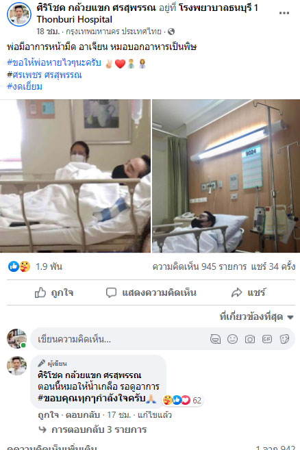 โดยเฟซบุ๊ก “ศรเพชร ศรสุพรรณ” ลูกชายได็โพสต์ภาพ “ศรเพชร” อยู่ที่โรงพยาบาล มีอาการอาเจียนหนัก แพทย์พบอาหารเป็นพิษ ให้น้ำเกลือ และยาฆ่าเชื้อ นอนแอดมินอยู่ที่โรงพยาบาลธนบุรี