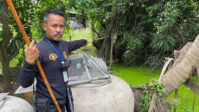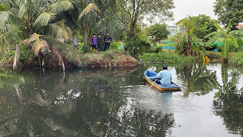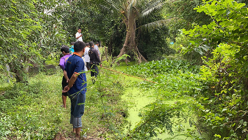 นางลัดดาวรรณ พันธุ์โพธิ์ทอง อายุ 70 ปี เจ้าของสวน เผยว่า เมื่อช่วงเช้าที่ผ่านมา ตนเดินมาเก็บมะนาวภายในสวน สังเกตเห็นหางสัตว์ชนิดหนึ่ง ที่หางมีรอยหยักคล้ายหางจระเข้ จึงตะโกนเรียกลูกเขยให้ออกมาดู ลูกเขยได้ตะโกนถามว่า เป็นตัวเงินตัวทองหรือเปล่า ขณะที่กำลังคุยกับลูกเขยอยู่นั้น จระเข้ได้คลานลงไปลอยคออยู่ในคลองที่มีผักตบชวาอยู่เป็นจำนวนมาก จึงรีบแจ้งเจ้าหน้าที่ให้มาช่วยกันจับ
