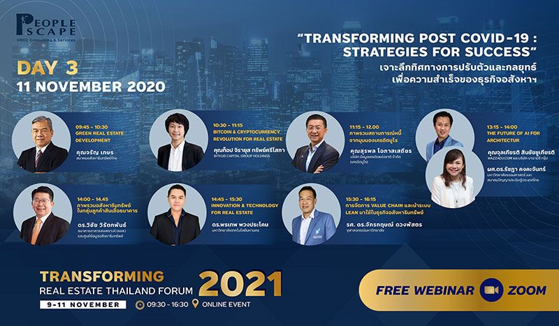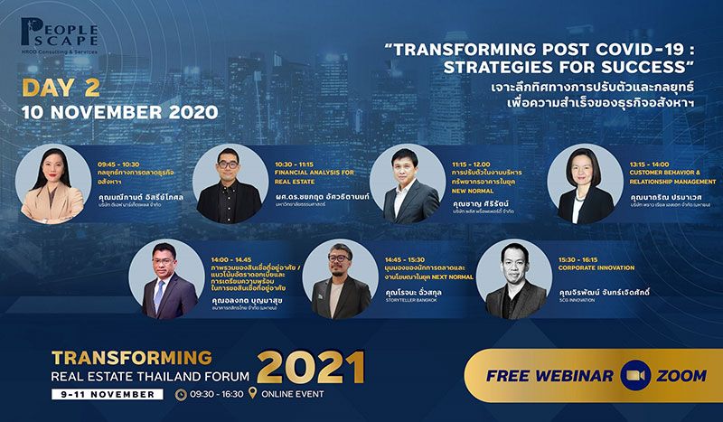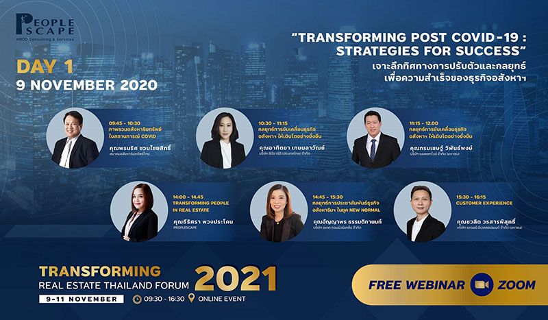“PEOPLESCAPE” ในเครือเมเจอร์ดีเวลลอปเม้นท์ จัดงานสัมมนาออนไลน์ฟรี “Transforming Real Estate Thailand Forum 2021” ชูคอนเซ็ปต์ “Transforming Post COVID-19 : Strategies for Success” ยกทัพ 21 วิทยากรหลากหลายความเชี่ยวชาญ การตลาด-การบริหาร-การเงิน-การสื่อสาร-HR-Tech ร่วมแนะทิศทางการปรับตัวและทรานส์ฟอร์มองค์กรอสังหาฯสู่อนาคต พร้อมจัด Workshop อัพสกิลและรีสกิลแบบพรีเมียม ต่อเนื่อง 3 วันเต็ม 9-11 พฤศจิกายน นี้ หวังช่วยเปิดมุมมองและเสริมองค์ความรู้ให้ผู้บริหาร บุคคลทั่วไปที่สนใจ ครอบคลุม Real Estate Ecosystem ทั้งหมด เปิดลงทะเบียนร่วมงานล่วงหน้าฟรี จำกัดจำนวน ตั้งแต่วันนี้ถึง 8 พฤศจิกายน 2564