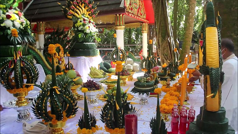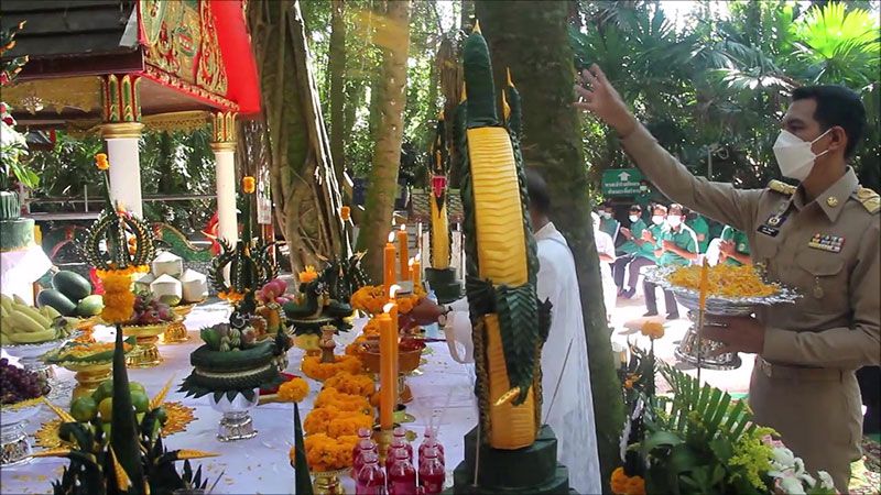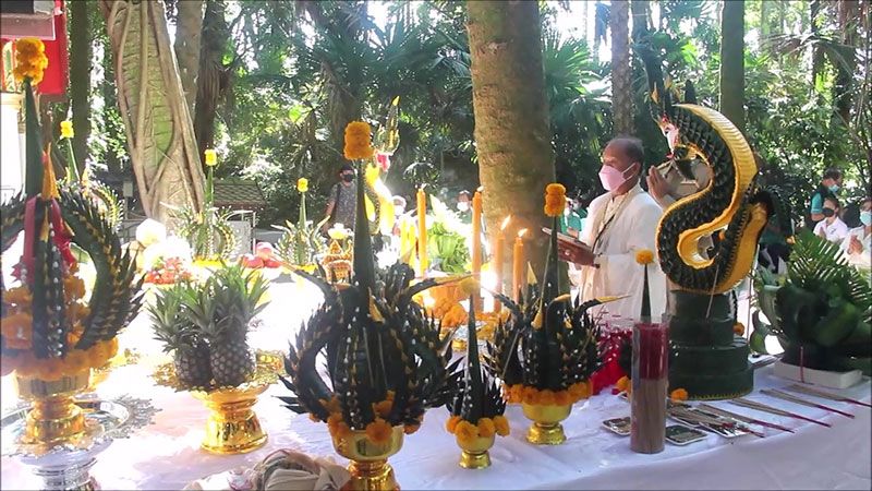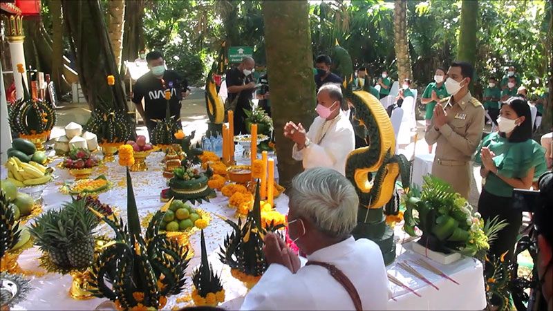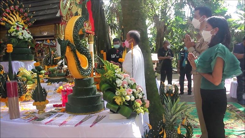 โดยจัดพานบายศรีพญานาคเศียร 9 ชั้นและเครื่องบูชาผลไม้ อาหารคาวหวานต่าง ๆ อีก 9 ชนิด มีนายชวการ คำวันสา พ่อพราหมณ์ประจำคำชะโนดทำพิธีบวงสรวง ถือเป็นการบวงสรวงพ่อปู่แม่ย่า ก่อนจะมีการเปิดแหล่งท่องเที่ยวคำชะโนดแล้วในวันพรุ่งนี้ 1 พ.ย.64 หลังจากปิดมานานกว่า 6 เดือน