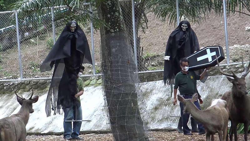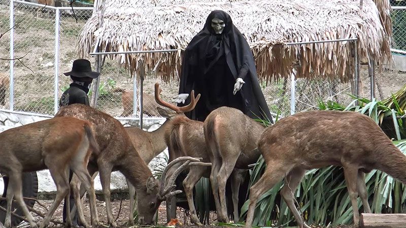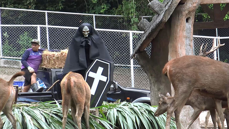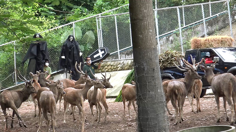 ในช่วงแรกที่นำผี 2 ตัวเข้าไปพร้อมโลงศพ กวางตกใจวิ่งหลบหนีกันชุลมุน เนื่องจากไม่เคยเห็นสิ่งแปลกปลอมเข้าไปในคอกเลี้ยง ในวันนี้ผู้อำนวยการสวนสัตว์สงขลาที่แต่งหน้าแต่งตาเป็นผีก็เข้าไปร่วมในการวางผี 2 ตัวพร้อมโลงศพ จุดที่ให้อาหารกวางเป็นประจำทุกวัน เพื่อสร้างสีสันวันฮาโลวีนให้กับนักท่องเที่ยวได้ถ่ายภาพ โดยกระจายอาหารกวาง เพื่อให้กวางได้กินอย่างทั่วถึง เมื่อวางเสร็จทุกคนก็ออกจากคอกกวาง