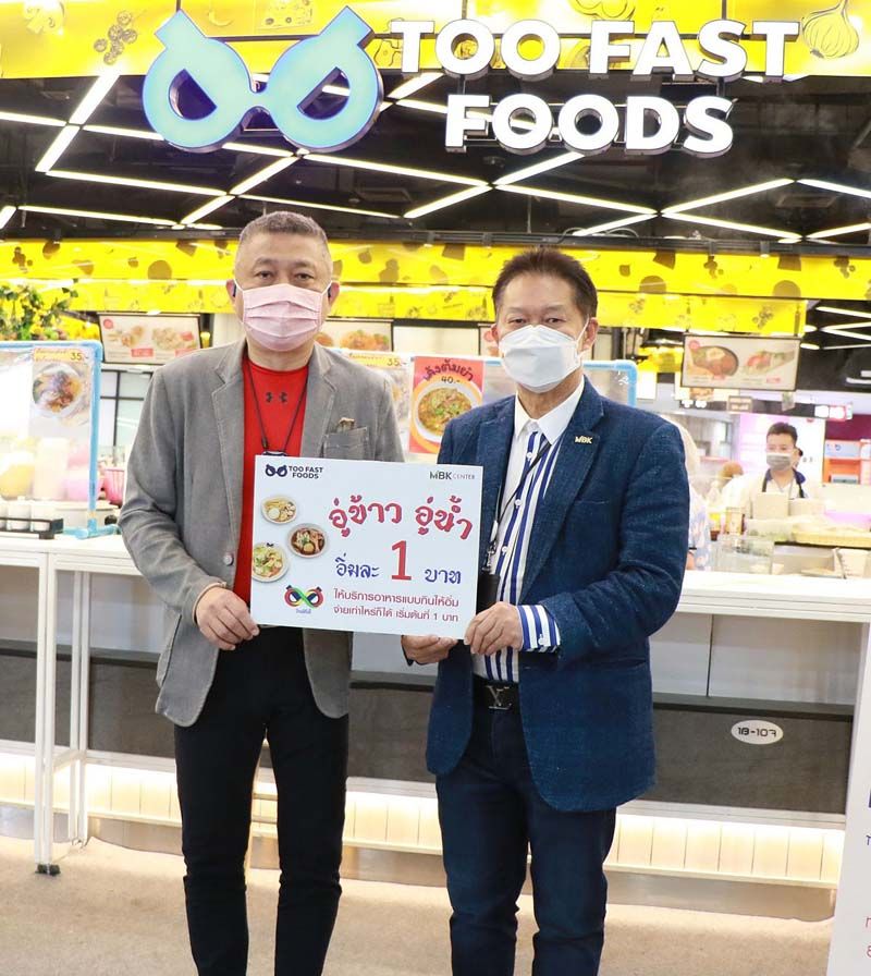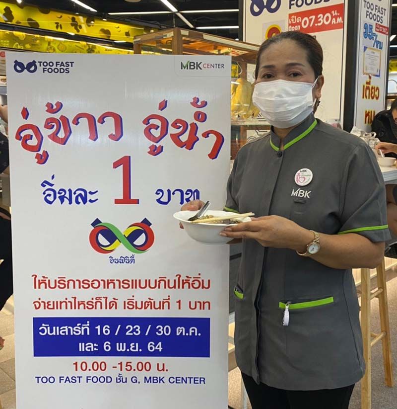 เป็นอีกองค์กรที่ทุ่มเทในการดูแลและช่วยเหลือสังคมผ่านโครงการต่างๆ อย่างไม่หยุดหย่อน ตอกย้ำเจตนารมณ์อันแน่วแน่ในการดำเนินธุรกิจที่มีความรับผิดชอบต่อสังคมและการมีส่วนร่วมพัฒนาสังคมอย่างยั่งยืน ล่าสุด เอ็ม บี เค เซ็นเตอร์(MBK Center) ร่วมกับ TOO FASTFOODS (ทู ฟาสต์ ฟู้ดส์) พันธมิตรร้านอาหารชั้นนำ จัดแคมเปญเพื่อสังคม“อู่ข้าว อู่น้ำ อิ่มละ 1 บาท” ให้บริการอาหารแบบกินให้อิ่ม จ่ายเท่าไรก็ได้ เพื่อแบ่งเบาภาระค่าครองชีพและบรรเทาความเดือดร้อนให้กับประชาชนที่ได้รับผลกระทบทางเศรษฐกิจจากสถานการณ์การระบาดของโควิด-19โดยจัดทุกวันเสาร์ตลอด 1 เดือนเต็มเริ่มมาตั้งแต่วันเสาร์ที่ 16 ตุลาคมที่ผ่านมา สิ้นสุดในวันเสาร์ที่6 พฤศจิกายน 2564 ในเวลา 10.00-15.00 น. โดยลูกค้าประชาชนสามารถเข้ามารับประทานอาหารที่ร้าน TOO FAST FOODS สาขาเอ็ม บี เค เซ็นเตอร์ ชั้น G ซึ่งมีหลากหลายเมนูให้เลือก อาทิ ข้าวมันไก่ และก๋วยเตี๋ยว (ไม่รวมเครื่องดื่มและลูกชิ้นปิ้ง) นอกจากการคำนึงถึงคุณภาพของวัตถุดิบและรสชาติอาหารแล้ว ทางร้านยังให้ความสำคัญกับการดูแลความสะอาดและความปลอดภัยตามมาตรการป้องกันโรคโควิด-19