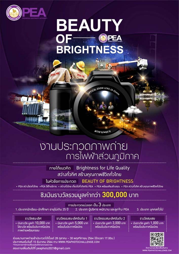 การไฟฟ้าส่วนภูมิภาค หรือ PEA เชิญชวนผู้รักการถ่ายภาพร่วมประกวดภาพถ่าย ภายใต้แนวคิด“Brightness for Life Qualityสว่างทั่วทิศ สร้างคุณภาพชีวิตทั่วไทย”ในหัวข้อ “Beauty of Brightness”โดยถ่ายภาพกิจกรรม หรือสินทรัพย์ของการไฟฟ้าส่วนภูมิภาคในรูปแบบใดก็ได้ ที่สามารถสะท้อนถึงภารกิจ และการดำเนินงานของการไฟฟ้าส่วนภูมิภาค ไม่ว่าจะเป็นการดำเนินการด้านระบบจำหน่ายไฟฟ้า การให้บริการด้านไฟฟ้า และกิจกรรมเพื่อสังคมและสิ่งแวดล้อม ชิงรางวัลและเงินสดมูลค่ารวมกว่า 300,000 บาท การประกวดครั้งนี้ ได้ช่างภาพและผู้ทรงคุณวุฒิระดับแถวหน้าของเมืองไทย ร่วมเป็นคณะกรรมการตัดสิน นำโดย ดาววาสิกศิริ วสันต์ ผึ่งประเสริฐ ตุลย์หิรัญญลาวัลย์ และ จุฬวิศว์ ศานติพงศ์เป็นต้น