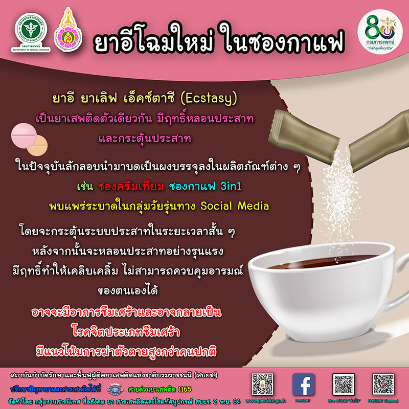 สถาบันบำบัดรักษาและฟื้นฟูผู้ติดยาเสพติดแห่งชาติบรมราชชนนี (สบยช.) กรมการแพทย์ เตือนปัจจุบันมีการลักลอบนำยาอีบรรจุในผลิตภัณฑ์ต่างๆ ทำให้สังเกตได้ยากขึ้น แนะผู้ปกครองหมั่นติดตามข่าวสารพร้อมสังเกตพฤติกรรมของบุตรหลาน หากพบสิ่งของต้องสงสัยรีบพูดคุยด้วยเหตุผลถึงผลเสียต่อสุขภาพและรีบพาไปพบแพทย์เพื่อเข้าสู่กระบวนการบำบัดรักษา