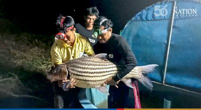 Locals residing along the banks of the Mekong River in Mukdahan caught a large spawning seven stripped carp (probarbus jullieni), weighing 40 kilograms, on Thursday. The rare carp was sold to the Fisheries Provincial Office under a conservation project to prevent the fish from becoming extinct.