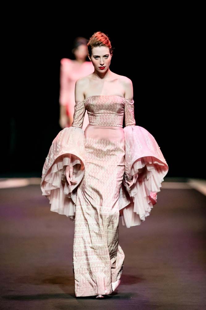 ชุดจาก SIRIVANNAVARI Couture ตัดเย็บจากผ้าทอของผู้เข้าประกวดมาตัดเย็บเป็นชุดที่มีดีไซน์ทันสมัย