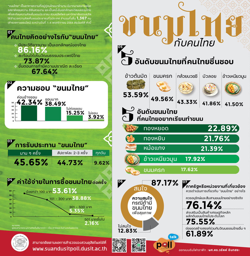7 พฤศจิกายน 2564 “สวนดุสิตโพล” มหาวิทยาลัยสวนดุสิต เปิดเผยผลสำรวจความคิดเห็นประชาชนทั่วประเทศ จำนวนทั้งสิ้น 1,367 คน (สำรวจทางออนไลน์) ระหว่างวันที่ 1-4 พฤศจิกายน 2564 หัวข้อ “ขนมไทยกับคนไทย” เพื่อสะท้อนความคิดเห็นกรณี “ขนมไทย” เป็นอาหารหวานที่อยู่คู่คนไทยมาช้านาน มีมากมายหลายชนิด รสชาติหอมหวาน สีสันสวยงาม และเป็นหนึ่งในเอกลักษณ์วัฒนธรรมไทย สรุปผลได้ ดังนี้