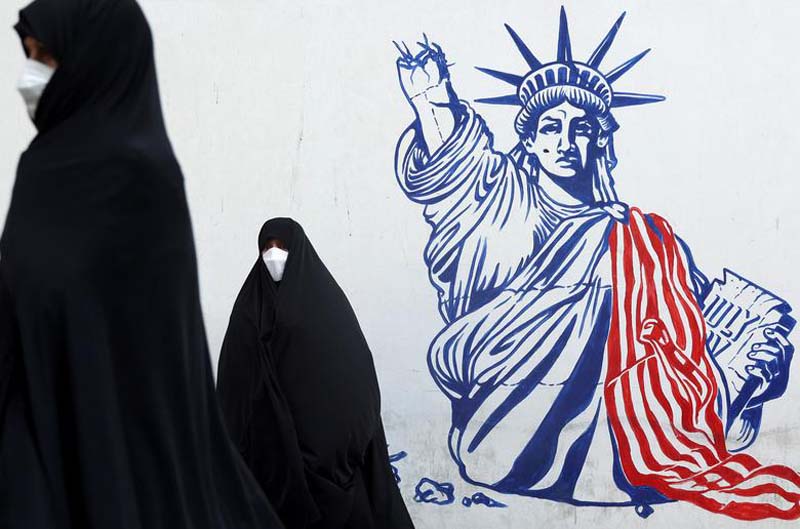 ไม่เอาสหรัฐฯ : หญิงผู้เข้าร่วมประท้วงในอิหร่าน ยืนอยู่ด้านหน้ากำแพงด้านนอกพื้นที่ที่เคยเป็นที่ตั้งของสถานทูตสหรัฐฯ ในกรุงเตหะราน ซึ่งมีภาพวาดผลงานศิลปะที่ต่อต้านสหรัฐฯ ระหว่างเข้าร่วมการชุมนุมรำลึกเนื่องในวาระครบรอบ 42 ปี ที่อิหร่านขับไล่สหรัฐฯ ออกนอกประเทศ