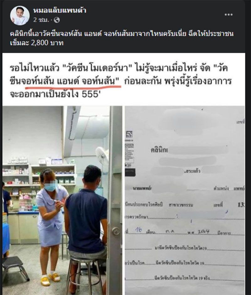 8 พฤศจิกายน 2564 เป็นที่ฮือฮาในโลกออนไลน์ เมื่อเพจดัง หมอแล็บแพนด้า แชร์ภาพชายหนุ่มรายหนึ่ง ที่อ้างว่าไปใช้บริการฉีดวัคซีนวัคซีนจอห์นสัน แอนด์ จอห์นสัน ที่คลินิกแห่งหนึ่งใน ราคาเข็มละ 2,800 บาท ซึ่งมีใบรับรองแพทย์ระบุว่า คลินิกดังกล่าวอยู่ในจังหวัดสระแก้ว