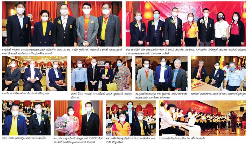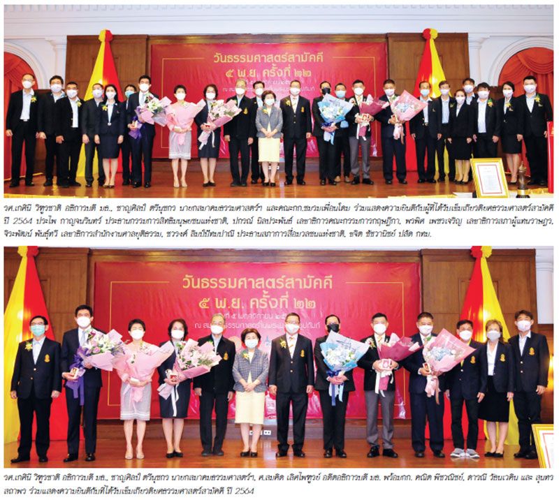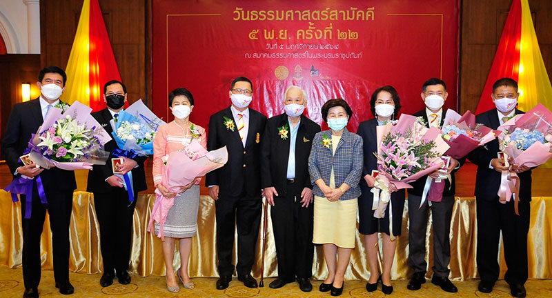 ดร.สันติภาพ เตชะวณิช ประธานชมรมเพื่อนโดม พร้อมด้วย รศ.เกศินี วิฑูรชาติ อธิการบดีมหาวิทยาลัยธรรมศาสตร์, ชาญศิลป์ ตรีนุชกร นายกสมาคมธรรมศาสตร์ฯ ร่วมถ่ายภาพกับผู้ได้รับมอบเข็มเกียรติยศธรรมศาสตร์สามัคคีปี 2564