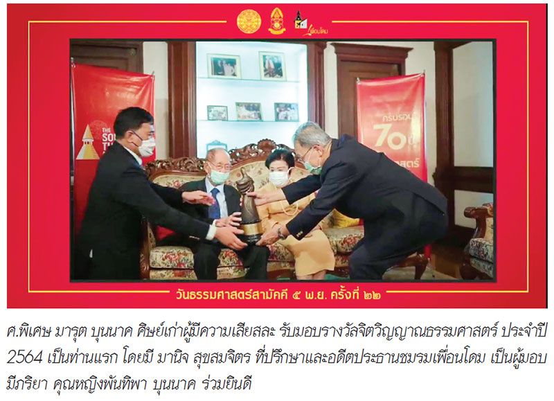 ในวาระพิเศษนี้ ชมรมเพื่อนโดม ประกาศยกย่องเชิดชูเกียรติและมอบรางวัล “จิตวิญญาณธรรมศาสตร์ ประจำปี 2564” ให้แก่ “ศ.(พิเศษ) มารุต บุนนาค” แกนนำนักศึกษาชุดบุกเข้ายึดมหาวิทยาลัยคืนเมื่อปี 2494 และได้รับใช้ชาติบ้านเมือง ตลอดจนบำเพ็ญตนอันเป็นประโยชน์และทรงคุณค่ายิ่งแก่ประเทศชาติ เหมาะสมทุกประการกับรางวัล “จิตวิญญาณธรรมศาสตร์”