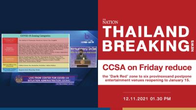 Also on Friday, the CCSA meeting led by Prime Minister Prayut Chan-o-cha decided to shift Chanthaburi province from “dark red” zone to “red” zone, bringing the list of provinces under maximum disease control from seven to six. Tak, Nakhon Si Thammarat, Narathiwat, Pattani, Yala and Songkhla are still marked “dark red”.