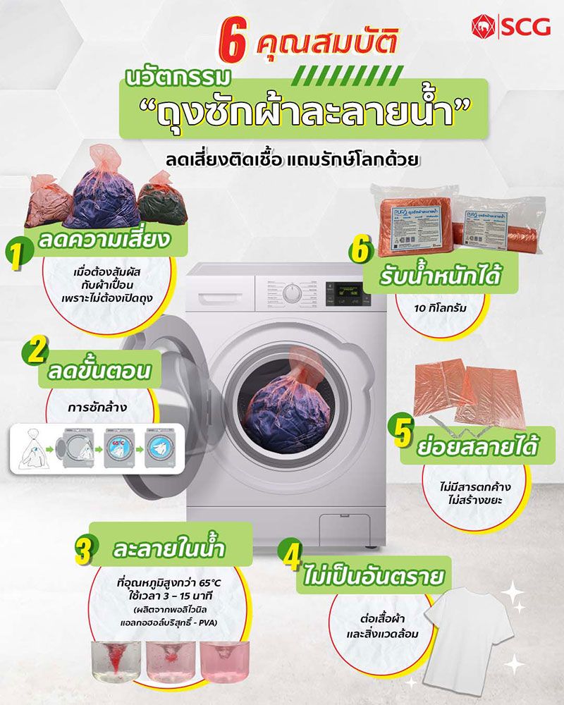 ท่ามกลางวิกฤตที่เมืองไทยยังต้องเผชิญกับสถานการณ์โควิด-19 เราได้เห็นหลายภาคส่วนนำความเชี่ยวชาญไปช่วยเหลือสังคม เช่นเดียวกันกับ “SCGP” ที่ได้ประยุกต์และพัฒนานวัตกรรมที่หลากหลายออกมาช่วยแก้ปัญหาและบรรเทาความเดือดร้อนให้กับสังคม ซึ่ง “ผู้ที่ต้องสัมผัสเสื้อผ้าที่ปนเปื้อนสารคัดหลั่งมีเชื้อโควิด-19”เช่น ผู้ปฏิบัติงานที่โรงซักผ้าในโรงพยาบาล และบุคลากรที่ทำงานในโรงพยาบาล เป็นอีกกลุ่มคนหนึ่งที่ต้องเผชิญกับความเสี่ยงในสถานการณ์โควิด-19 นี้ “ถุงซักผ้าละลายน้ำ” นวัตกรรมจาก SCGP ที่คิดค้นขึ้นเพื่อช่วยให้ไม่ต้องสัมผัสกับผ้าติดเชื้อโดยตรง แค่ผู้ใช้งานนำถุงที่ใส่ผ้าติดเชื้อเข้าเครื่องซักผ้าที่มีอุณหภูมิน้ำขณะซัก 65C° ขึ้นไปถุงก็จะเริ่มละลายในน้ำภายใน3-15 นาที (อัตราการละลายน้ำขึ้นอยู่กับอุณหภูมิของน้ำ และการหมุนวนในเครื่องซักผ้า) จึงเป็นอีกนวัตกรรมทางเลือกหนึ่งที่ช่วยปกป้องเจ้าหน้าที่ซักผ้าไม่ต้องสัมผัสกับผ้าติดเชื้อ เพียงแค่ผู้ป่วยเปลี่ยนชุดใส่ไว้ในถุงผ้าเมื่อเต็มแล้ว ทางพยาบาลสามารถนำผ้าที่อยู่ในถุงส่งต่อไปยังหน่วยบริการการซักผ้าได้ทันที