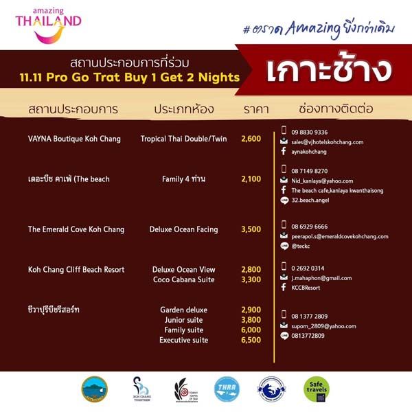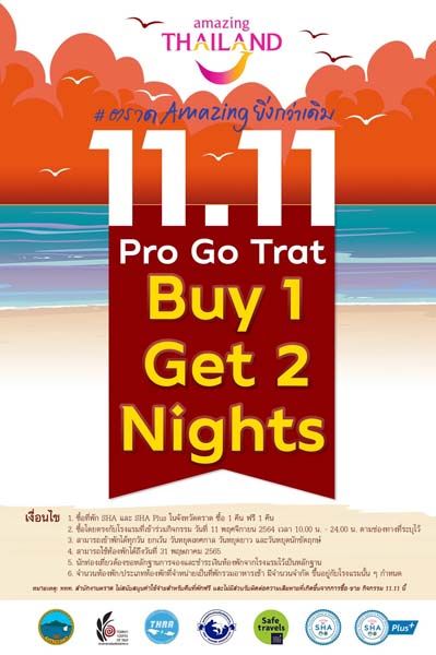 นอกจากนี้ การท่องเที่ยวแห่งประเทศไทย สำนักงานตราดร่วมกับสถานประกอบการโรงแรมในจังหวัดตราดจัดกิจกรรมซื้อห้องพัก 1 คืน แถมให้อีก 1 คืน ซึ่งให้นักท่องเที่ยวซื้อได้ที่โรงแรมในจังหวัดตราดที่เข้าร่วมโครงการ ซึ่งจะให้โอกาสในวันที่ 11 พฤศจิกายน 2564 ที่สามารถจองได้ภายใน 24.00 น.ของวันนี้ -005