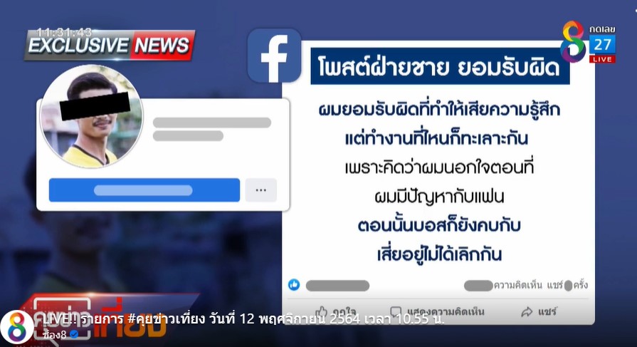 ทางรายการ “คุยข่าวเที่ยง” ก็พยายามฟังความหลายฝ่ายพยายามติดต่อกับทางสามีน้องเอินที่ชื่อ “ฟิล์ม” แต่ยังไม่ยอมรับสาย เลยตามไปดูจากหน้าเพจเฟซบุ๊ก ของฟิล์ม ปรากฎว่าฝ่ายสามีเคยออกมาโพสต์ ว่า “ผมยอมรับผิดที่ทำให้เสียความรู้สึก แต่ทำงานที่ก็ทะเลาะกัน เพราะคิดว่าผมนอกใจตอนที่ผมมีปัญหากับแฟน ตอนนั้นบอสก็ยังคบกับเสี่ยอยู่ไม่ได้เลิกกัน” และอีกโพสต์ว่า “ขอหย่ากับผมทุกวัน จะเลิกกับผมทุกวัน ง้อจนเค้าเก็บเสื้อผ้าหนีไป” และอีกโพสต์บอกว่า “เรื่องแอบแซ่บผมกล้าสาบานว่า ผมกับบอสไม่เคยมีอะไรกัน เรื่องที่ไม่หย่า เพราะฝ่ายหญิงจะเอาเงิน 2 ล้าน พอไม่ได้เงินก็มาโพสต์และจะประจาน” “แล้วที่ผมทักชวนไปหย่า เพราะฝ่ายหญิงก็โพสต์ว่ามีเด็กใหม่ มีผู้ชายคนใหม่ ที่อยากหย่าเพราะอยากจบปัญหาเรื่องนี้”