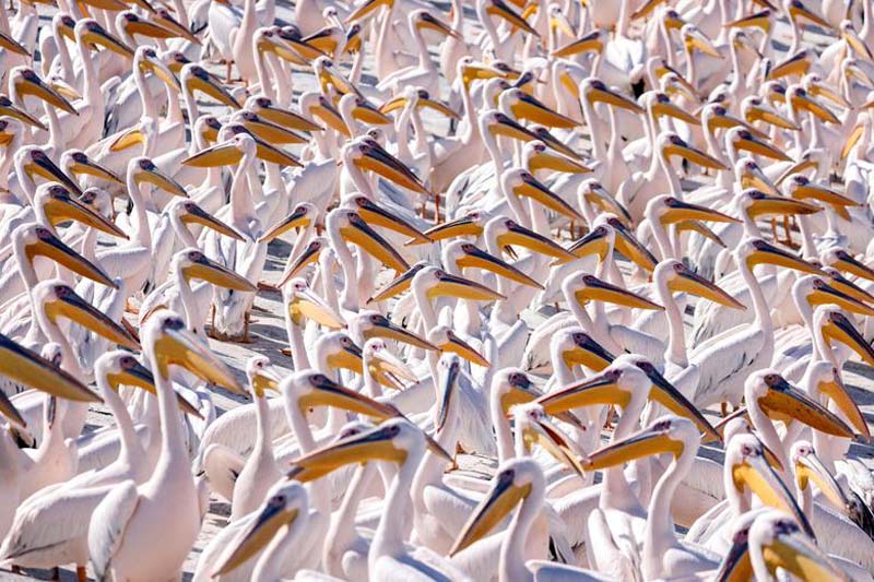 รวมกลุ่ม : ฝูงนกเพลิแกนขาวจำนวนมาก รวมตัวจับกลุ่มเตรียมหาอาหาร หลังการอพยพเดินทางไกล บริเวณหนองน้ำขนาดใหญ่แห่งหนึ่ง ในเมืองมิชมาร์ ฮาชารอน ทางตอนกลางของอิสราเอล