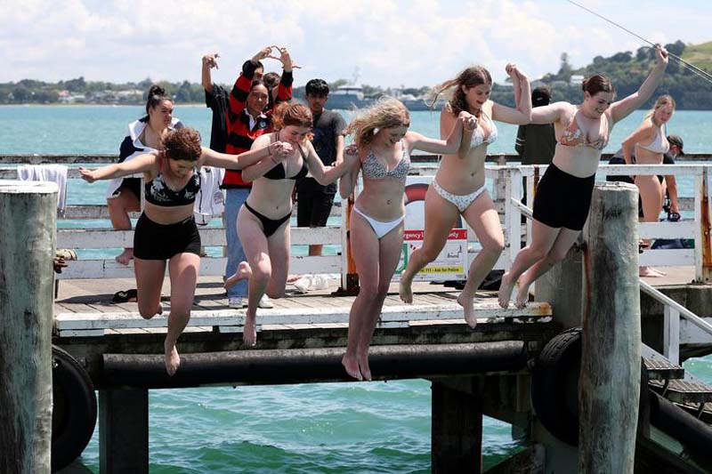 โดดฉลอง : สาวๆ ในชุดบิกินีจับมือกันกระโดดจากท่าเรือลงทะเล ในนครออคแลนด์ เมืองใหญ่สุดของประเทศนิวซีแลนด์ เพื่อฉลองหลังจากรัฐบาลผ่อนคลายมาตรการล็อกดาวน์และจำกัดต่างๆ เพื่อสกัดการระบาดของโควิด-19 เป็นที่เรียบร้อยแล้ว