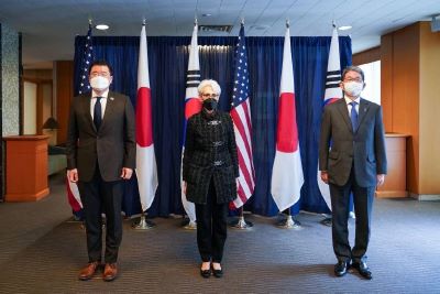 But Sherman was by herself to take questions from reporters, saying there were some “bilateral differences” between Seoul and Tokyo, “that were continuing to be resolved” and “unrelated” to the earlier three-way meeting.
