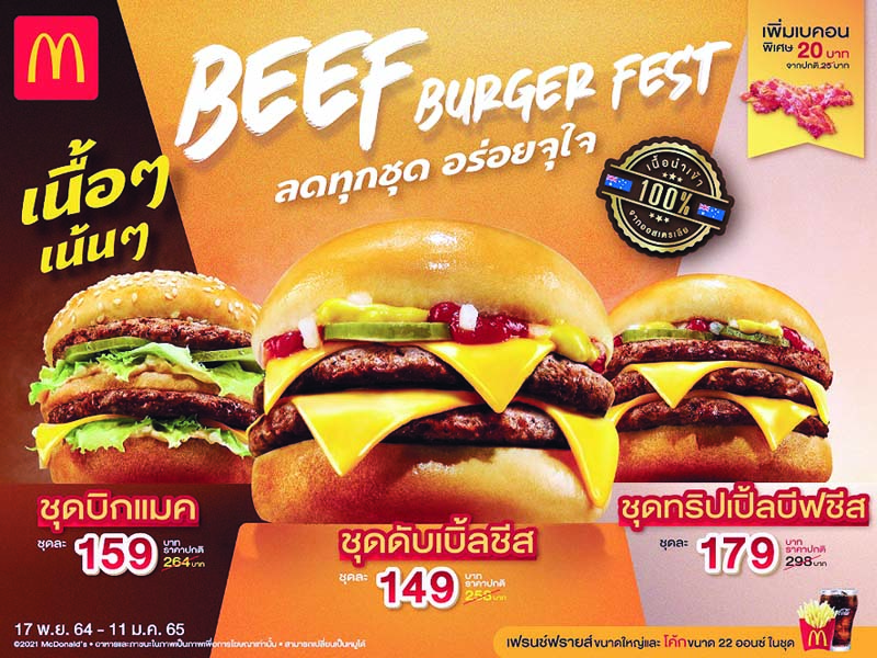 แมคโดนัลด์ ชวนชิมเบอร์เกอร์เนื้อวัว 100% นำเข้าจากประเทศออสเตรเลีย 3 เมนูสุดฮิต ดับเบิ้ลชีสเบอร์เกอร์, บิ๊กแมค และ ทริปเปิ้ลบีฟชีสเบอร์เกอร์ เริ่มต้นชิ้นละ 99 บาท ถึง 11 ม.ค. 2565 ที่ ร้านแมคโดนัลด์
