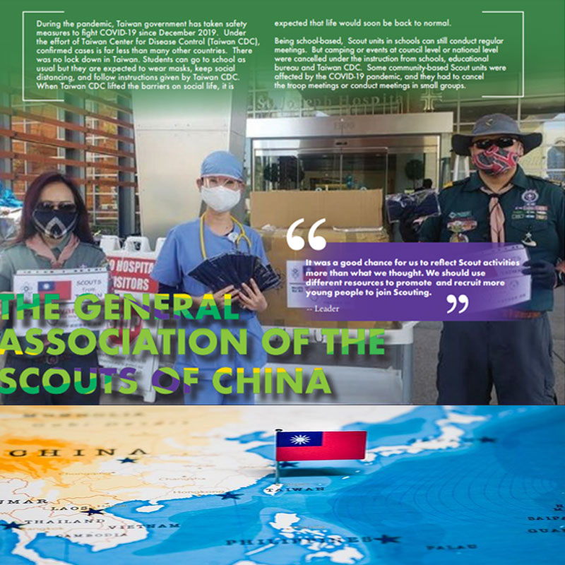 ไต้หวัน (Taiwan) สำนักงานลูกเสือแห่งชาติไต้หวัน ได้ส่งแนวทางปฏิบัติไปยังทุกหน่วยลูกเสือท้องถิ่น ให้ใส่หน้ากาก ล้างมือ วัดอุณหภูมิร่างกาย จัดทำวีดิโอแนะนำการปฏิบัติตนในช่วงโรคระบาด ช่วยแพคหน้ากากอนามัยเพื่อให้สามารถแจกจ่ายได้รวดเร็วขึ้น ใช้การรณรงค์ให้เว้นระยะห่างทางสังคมผ่านเฟสบุค และทำวีดีโอขอบคุณเจ้าหน้าที่สาธารณสุขและแพทย์พยาบาล ผู้นำลูกเสือหลายคนบริจาคเงินเพื่อซื้อของจำเป็นให้หน่วยลูกเสือและหน่วยพยาบาลท้องถิ่นทั้งยังได้ส่งสิ่งของไปช่วยลูกเสือสหรัฐอเมริกา และญี่ปุ่นด้วย