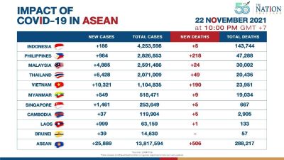 The number of Covid-19 cases crossed 13.81 million across Southeast Asia, with 25,889 new cases reported on Monday (November 22), lower than Sunday’s tally at 27,526. New deaths are at 506, increasing from Sunday’s number of 364. Total Covid-19 deaths in Asean are now at 288,217.