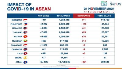 The number of Covid-19 cases crossed 13.79 million across Southeast Asia, with 27,526 new cases reported on Sunday (November 21), lower than Saturday’s tally at 27,662. New deaths are at 364, decreasing from Saturday’s number of 460. Total Covid-19 deaths in Asean are now at 288,615.