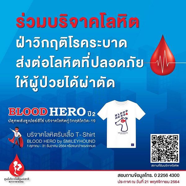 จึงขอเชิญชวนฮีโร่ที่มีสุขภาพดีครบกำหนด 3 เดือนแล้ว บริจาคโลหิตเพื่อนำไปรักษาผู้ป่วยตามโรงพยาบาลทั่วประเทศอย่างเร่งด่วนสำหรับผู้บริจาคโลหิต วันนี้-31 ธันวาคม 2564 รับเสื้อยืด“BLOODHERO”เป็นที่ระลึกหรือจนกว่าของจะหมด ออกแบบโดย SMILEYHOUND BY GREYHOUND