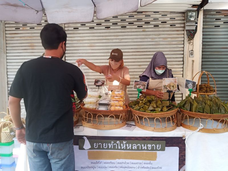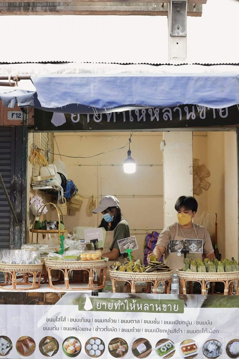 ด้าน 2 หลานสาวผู้สร้างแบรนด์ขนมไทย “ยายทำให้หลานขาย” อย่าง “ปู-อนงค์นาฏ” และ “นัท-พัชริดา” ได้เปิดเผยว่า “เราสองคนมีงานประจำที่ทำกันอยู่ และมีรับ Job ถ่ายรูปกันบ้าง จนถึงช่วงโควิดรอบที่สองงานถ่ายรูปน้อยลง เราก็อยากหารายได้เสริม แล้วเห็นว่าบ้านเราทำขนมกันอยู่แล้ว เราก็เลยเริ่มจากเอาขนมของคุณยายมาถ่ายรูปเล่น แล้วลงโพสต์ลงในเฟซบุ๊กส่วนตัวของตัวเองก่อน แล้วมีเพื่อนๆ ในระแวกบ้านสนใจ ก็เลยพรีออเดอร์แล้วก็ไปส่งเอา ตอนนั้นยังไม่มีเพจ จนมีลูกค้าเข้ามาพูดคุยกับเราเพราะเห็นว่าเราเป็นเด็ก เค้าถามว่าใครทำ ทำกันเองหรอ เราก็จะตอบว่า ยายทำค่ะ ขนมของที่บ้าน หนูเอามาขาย แล้วก็เลยเป็นจุดเริ่มต้นของแบรนด์คุณยายทำให้หลานขาย จากนั้นก็เลยเปิดเพจเพราะฐานลูกค้าเริ่มกว้างขึ้นแล้วก็สร้างแบรนด์มาจนถึงตอนนี้ค่ะ จุดเด่นขนมของเราก็คือ เรื่องรสชาติ ที่มันรักษาความดั้งเดิมโบราณเอาไว้ สองก็คือเรื่องรูปลักษณ์ที่แตกต่าง วิธีการห่อขนมแต่ละชนิดจะไม่เหมือนที่อื่น อย่างขนมสอดไส้ก็ไม่มีเตี่ยวทางมะพร้าวคาด จะเป็นร้านเดียวเลยที่ไม่เหมือนใคร แล้วก็ขนมเทียนก็ใช้ไม้กลัด ที่อื่นก็จะใช้สอดใบตอง พอมารุ่นเราแพ็คเกจจิ้งของยายทำให้หลานขาย ก็จะไม่ใช่แบบธรรมดาทั่วไป เราก็จะมีใส่แพ็คเกจจิ้งชะลอมให้ดูถือแล้วรู้สึกว่าการถือขนมไทยไปฝากมันมีคุณค่านะ ด้วยรสชาติบวกกับความทันสมัยมันก็ไปด้วยกันได้ค่ะ”