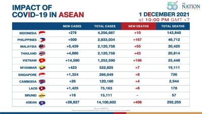 The number of Covid-19 cases crossed 14.1 million across Southeast Asia, with 28,827 new cases reported on Wednesday (December 1), higher than Tuesday’s tally at 26,937. New deaths are at 498, decreasing from Tuesday’s number of 370. Total Covid-19 deaths in Asean are now at 292,255.
