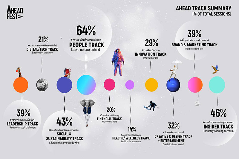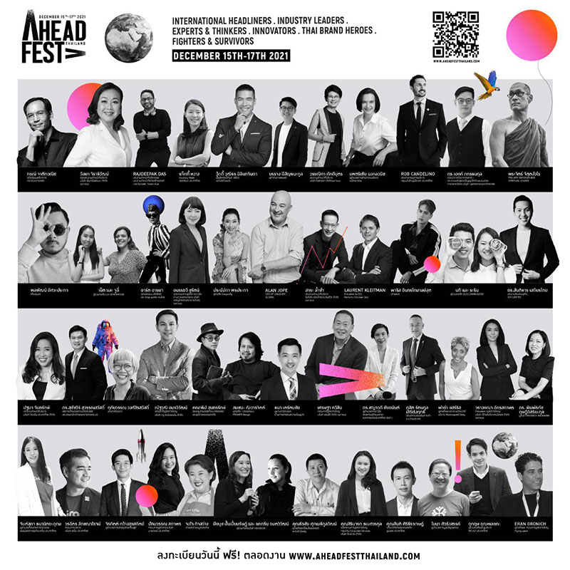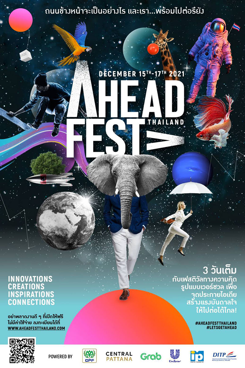 ครั้งแรกกับ AHEAD ! FEST THAILAND เฟสติวัลทางความคิดรูปแบบเวอร์ชวล 3 วันเต็ม จัดในลักษณะ Cross Lane เพื่อเปิดโลกแบบไม่ปิดกั้น อัดแน่นด้วยบทสนทนาสร้างสรรค์ การเสวนาแลกเปลี่ยนมุมมอง และกิจกรรมรูปแบบเวิร์คช็อป ที่คัดพิเศษให้ตอบโจทย์การใช้งานในชีวิตจริง จุดประกายไอเดียพร้อมสร้างแรงบันดาลใจ ให้คนไทยทุกคนและประเทศไทยไปต่อได้จริง และไปได้ไกลกว่า ทั้งหมดนี้จะเกิดขึ้นในวันที่ 15-17 ธันวาคม 2564 กิจกรรมดีๆ แบบฟรี! ตลอดงาน เพื่อให้ทุกคนได้รับประโยชน์จากงานนี้แบบเต็มๆ
