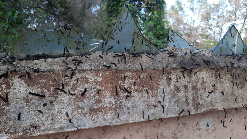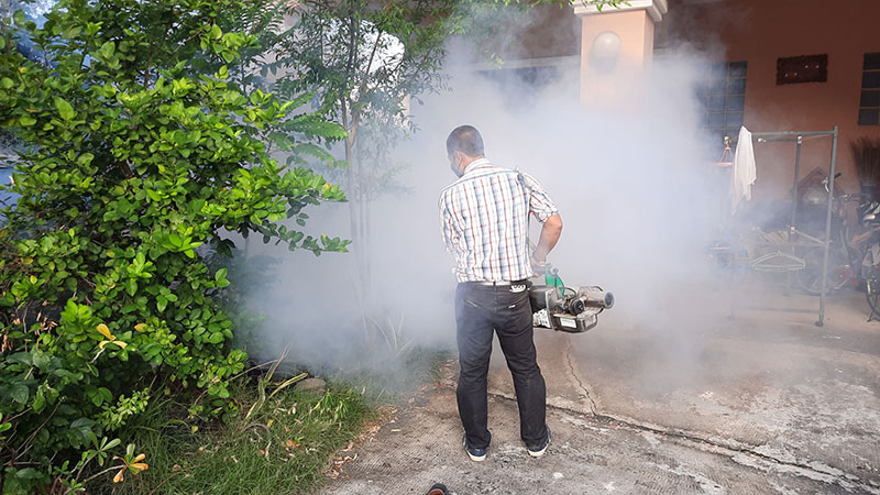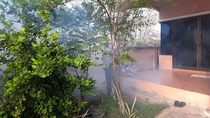 เมื่อช่วงเช้าที่ผ่านมา วันที่ 29 พ.ย.64 นาย สุรศักดิ์ ศรีพระราม ผู้ใหญ่บ้านหมู่ที่ 10 ต.ในคลองบางปลากด นำทีมงานและเครื่องพ่นยาแบบหมอกควันจำนวน 2 เครื่อง ลงเดินเท้าฉีดพ่นตามแนวกำแพงและบ้านเรือนประชาชนที่ถูกกองทัพหนอนบุกบ้านทุกหลังคาเรือน โดยน้ำยาที่ฉีดพ่นฆ่าหนอนเป็นสารตัวเดียวกันที่ใช้กำจัดยุงลายซึ่งใช้ผสมกับน้ำมันดีเซลแต่ใส่ในปริมาณมากกว่า 10 เท่า หลังจากที่ฉีดพ่นแล้วเสร็จสังเกตพบว่าตัวหนอนหล่นลงมาตายเกลื่อนพื้นเป็นจำนวนมาก บางตัวยังคลานชักดิ้นชักงออยู่ คาดน่าจะตายเกือบทั้งหมด ก่อนที่จะประสานทางเจ้าของบ้านช่วยกันเก็บกวาดซากตัวหนอนไปทิ้ง