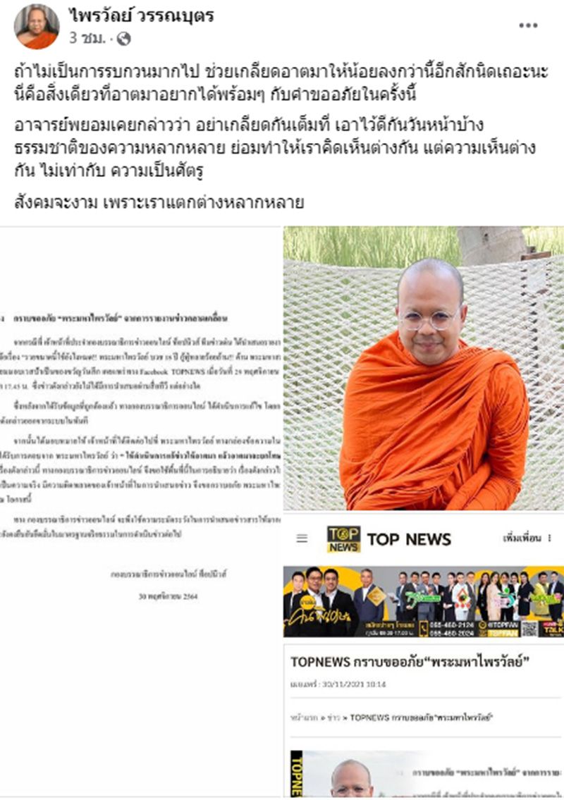 ทั้งนี้สืบเนื่องจาก ก กองบรรณาธิการข่าวออนไลน์ ท็อปนิวส์ ทำหนังสือ ขออภัย จากการรายงานข่าวคลาดเคลื่อน หัวข้อเรื่อง “รวยขนาดนี้ใช้ยังไงหมด!! พระมหาไพรวัลย์ บวช 18 ปี อู้ฟูหลายร้อยล้าน!! และได้รับการตอบจาก พระมหาไพรวัลย์ ว่า ” ให้ดำเนินการแก้ข่าวให้อาตมา แล้วอาตมาจะยกโทษให้ “