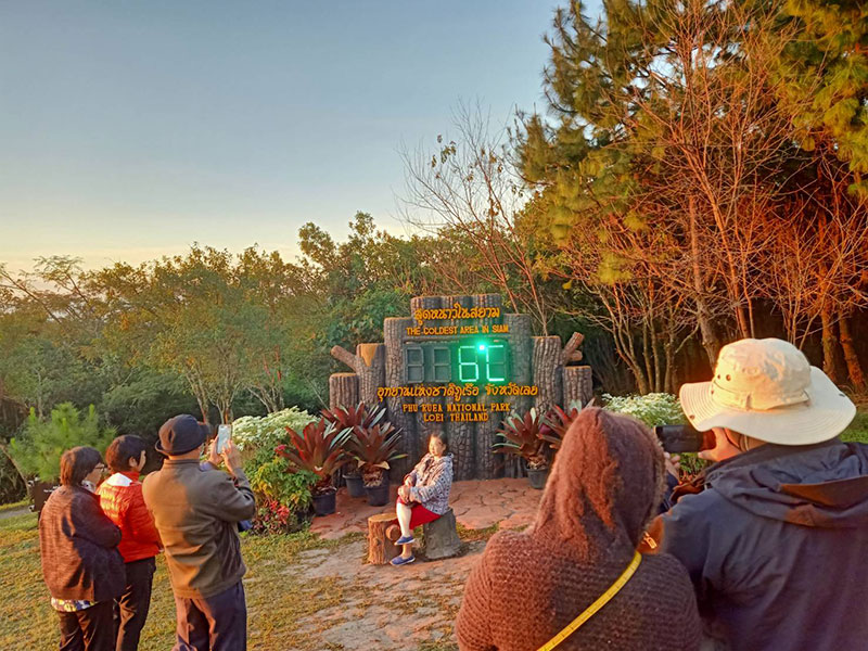 ด้านนายฑีฆาวุฒิ ศรีบุรินทร์ หัวหน้าอุทยานแห่งชาติภูเรือ กล่าวว่า บรรยากาศการท่องเที่ยวบนยอดภูเรือว่ายังคงมีนักท่องเที่ยวเดินทางมาสัมผัสอากาศต่อเนื่อง บนยอดภูเรือ จ.เลย สภาพอากาศในวันนี้หนาวกว่าทุกวัน อุณหภูมิลดลงจากเมื่อวาน 1-2 องศา วันนี้ต่ำสุดยอดภูเรือวัดได้ 10 องศาเซลเซียส นักท่องเที่ยวเตรียมลุ้นเลขตัวเดียวในช่วงปลายเดือนนี้และต้นเดือนหน้า อุณหภูมิต่ำสุด อ.เมืองเลย ปี 2563 = 11.8 องศาเซลเซียส เมื่อ 6 ธ.ค. 2563 อุณหภูมิต่ำสุด อ.เมืองเลย ปี 2564 = 8.5 องศาเซลเซียส เมื่อ 3 มกราคม 2564