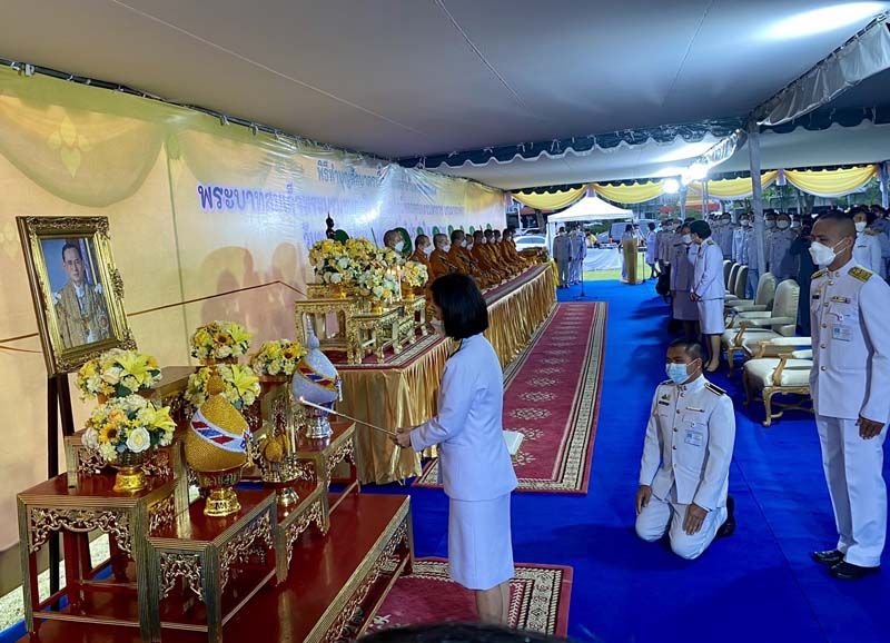 ที่พลับพลาพิธี บริเวณสนามหญ้ากระทรวงศึกษาธิการ พระสงฆ์ จำนวน 10 รูป ขึ้นนั่งอาสนะสงฆ์ ประธานในพิธีจุดธูปเทียนบูชาพระรัตนตรัย จุดเครื่องทองน้อยหน้าพระบรมฉายาลักษณ์พระบาทสมเด็จพระบรมชนกาธิเบศร มหาภูมิพลอดุลยเดชมหาราช บรมนาถบพิตร เจ้าหน้าที่กรมการศาสนา อาราธนาศีล ประธานสงฆ์ให้ศิล