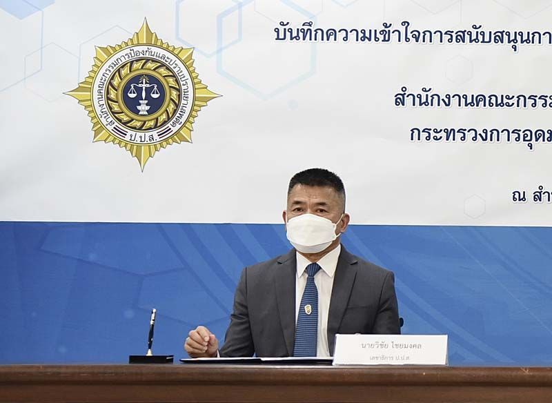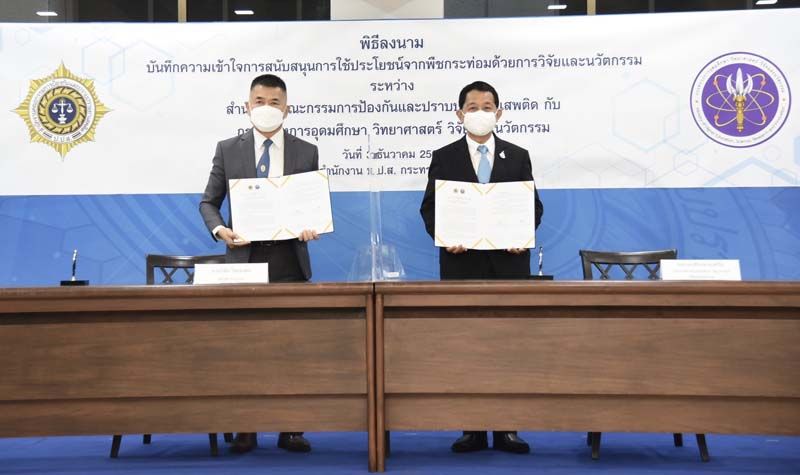 นายวิชัย ไชยมงคล เลขาธิการคณะกรรมการป้องกันและปราบปรามยาเสพติด (เลขาธิการ ป.ป.ส.) พร้อมด้วย ศ.ดร.นพ.สิริฤกษ์ ทรงศิวิไล ปลัดกระทรวงการอุดมศึกษา วิทยาศาสตร์ วิจัยและนวัตกรรม ร่วมลงนามในบันทึกความเข้าใจความร่วมมือทางวิชาการ (MOU) การสนับสนุนการใช้ประโยชน์จากพืชกระท่อมด้วยการวิจัยและนวัตกรรม ณ สำนักงาน ป.ป.ส. (ดินแดง) โดยมี ดร.วิภารัตน์ ดีอ่อง ผู้อำนวยการสำนักงานการวิจัยแห่งชาติ และนายมานะ ศิริพิทยาวัฒน์ รองเลขาธิการคณะกรรมการป้องกันและปราบปรามยาเสพติด เป็นพยานความร่วมมือ